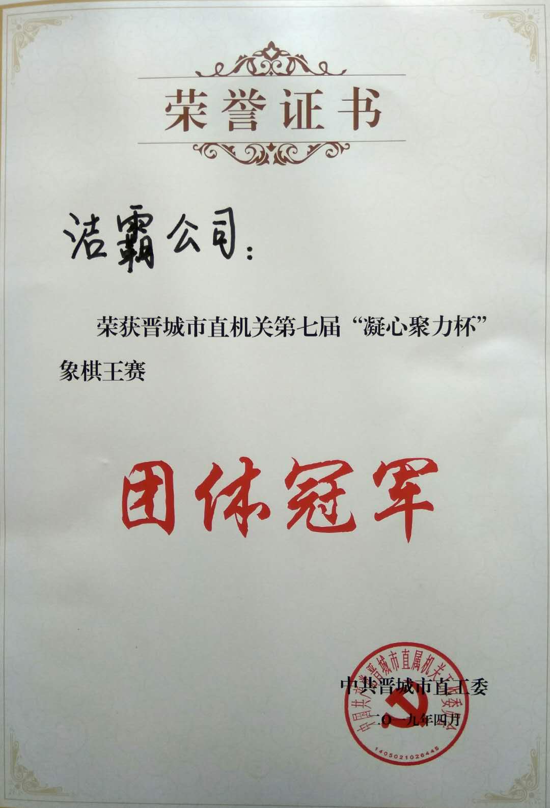 我公司榮獲晉城市直機關第七屆“凝心聚力杯”象棋王賽團體冠軍 |