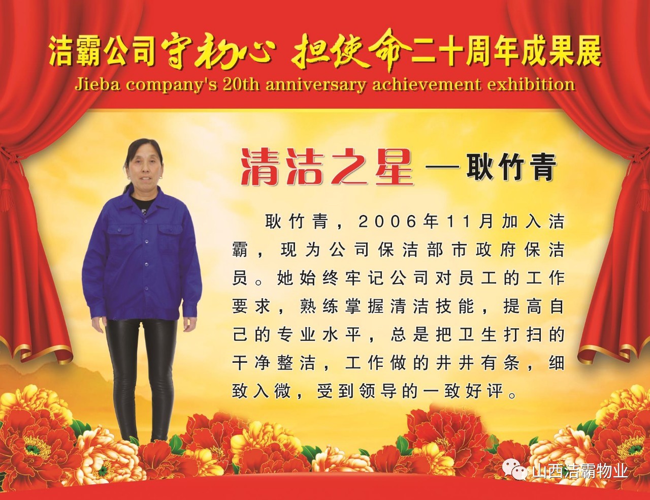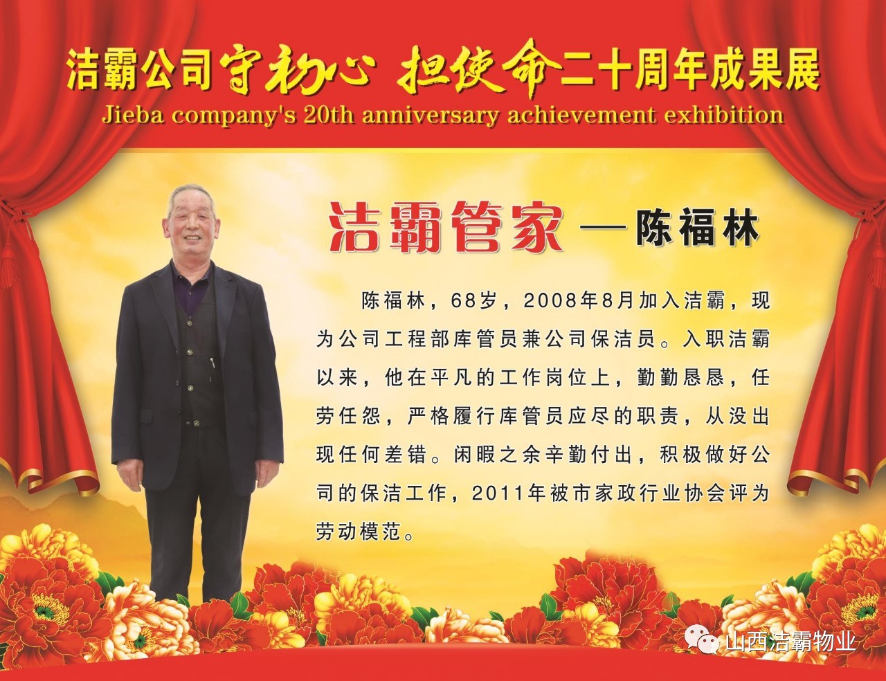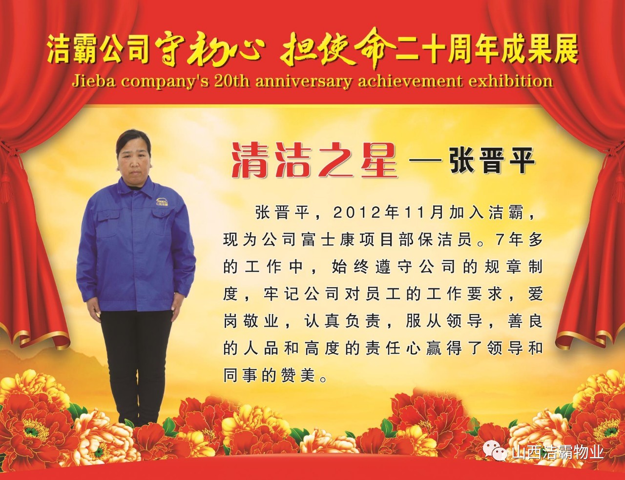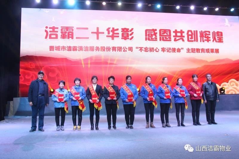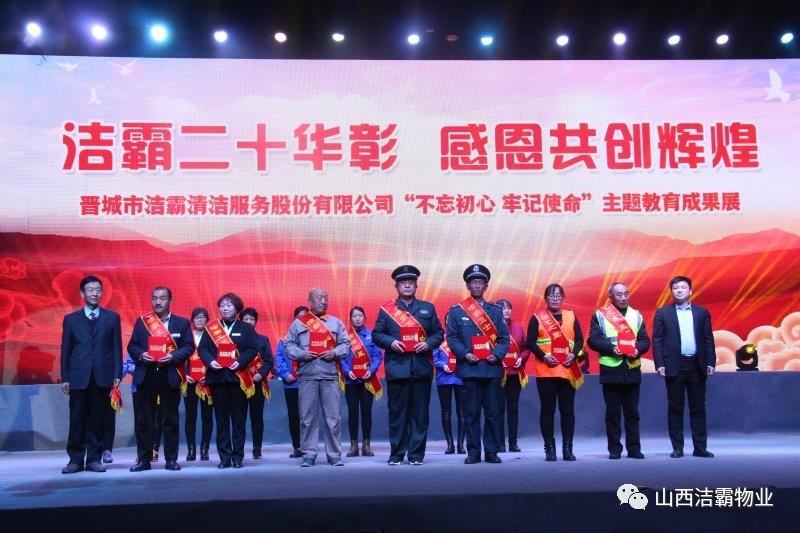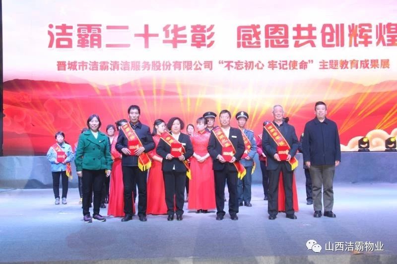 本次晚會(huì)以“潔霸二十華彰,感恩共創(chuàng)輝煌”為主題,此次慶典的核心思想是“感恩”,主要角色是潔霸的創(chuàng)業(yè)者。為此,公司對(duì)入職潔霸的創(chuàng)業(yè)功勛和一線員工進(jìn)行了表彰獎(jiǎng)勵(lì)。本次晚會(huì)共設(shè)8個(gè)獎(jiǎng)項(xiàng),包括“潔霸先鋒”“奉獻(xiàn)之星”“管理之星”“潔霸管家”“潔霸工匠”“清潔之星”“潔霸衛(wèi)士”“園藝之星”等。他們是:李山虎、張永智、史志霞、陳福林、王紅軍、余艷青、劉二丑、成艷粉、楊改梅、王書玲、張國榮、耿竹青、張粉霞、宋秋苗、陳先梅、張晉平、張偉山、趙瑞軍、王廣平、郭志云。晉城市原副市長成育廷、晉城市商務(wù)局原局長王新善、晉城市非公和社會(huì)組織工委書記郎軍芳、晉城市婦聯(lián)三級(jí)調(diào)研員李蓮菊、晉城市總工會(huì)商貿(mào)輕紡煙草服務(wù)業(yè)工會(huì)主席張玉濤、晉城市城區(qū)財(cái)政局局長翟明太等領(lǐng)導(dǎo)為他們頒獎(jiǎng)。
