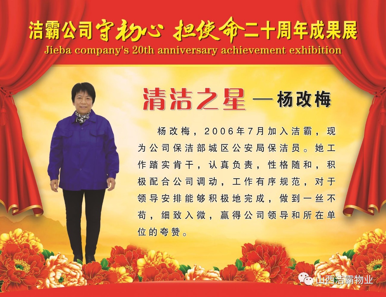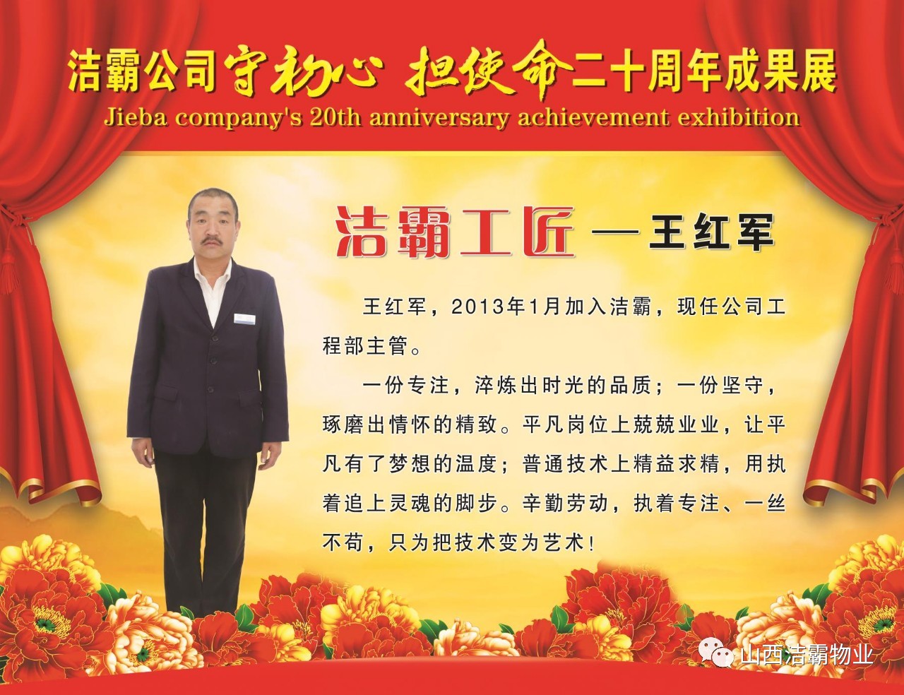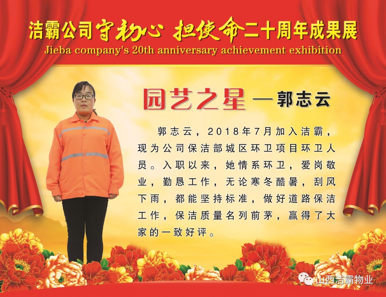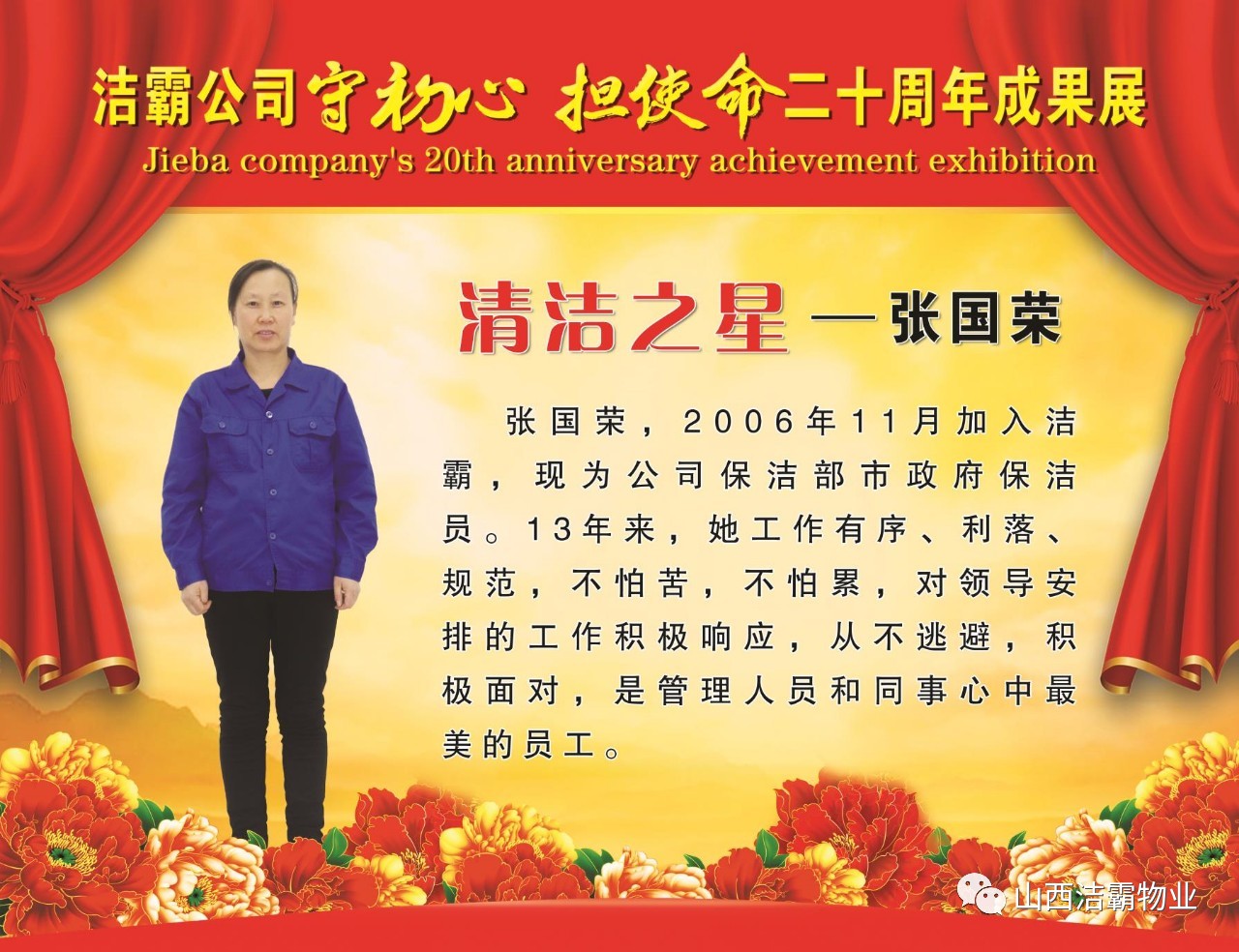 本次晚會(huì)以“潔霸二十華彰,感恩共創(chuàng)輝煌”為主題,此次慶典的核心思想是“感恩”,主要角色是潔霸的創(chuàng)業(yè)者。為此,公司對(duì)入職潔霸的創(chuàng)業(yè)功勛和一線員工進(jìn)行了表彰獎(jiǎng)勵(lì)。本次晚會(huì)共設(shè)8個(gè)獎(jiǎng)項(xiàng),包括“潔霸先鋒”“奉獻(xiàn)之星”“管理之星”“潔霸管家”“潔霸工匠”“清潔之星”“潔霸衛(wèi)士”“園藝之星”等。他們是:李山虎、張永智、史志霞、陳福林、王紅軍、余艷青、劉二丑、成艷粉、楊改梅、王書玲、張國榮、耿竹青、張粉霞、宋秋苗、陳先梅、張晉平、張偉山、趙瑞軍、王廣平、郭志云。晉城市原副市長成育廷、晉城市商務(wù)局原局長王新善、晉城市非公和社會(huì)組織工委書記郎軍芳、晉城市婦聯(lián)三級(jí)調(diào)研員李蓮菊、晉城市總工會(huì)商貿(mào)輕紡煙草服務(wù)業(yè)工會(huì)主席張玉濤、晉城市城區(qū)財(cái)政局局長翟明太等領(lǐng)導(dǎo)為他們頒獎(jiǎng)。