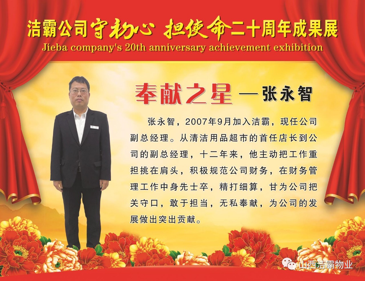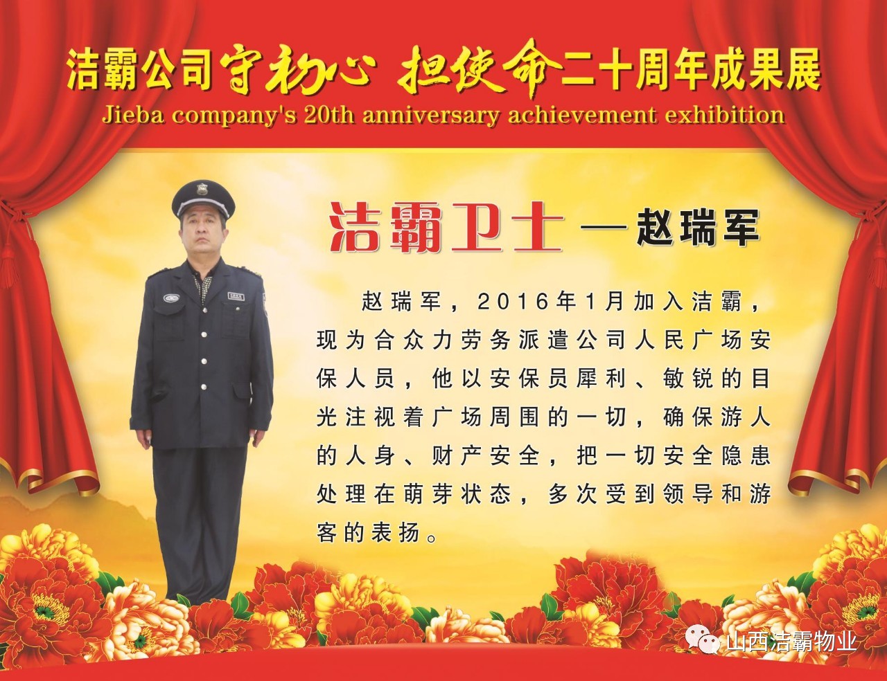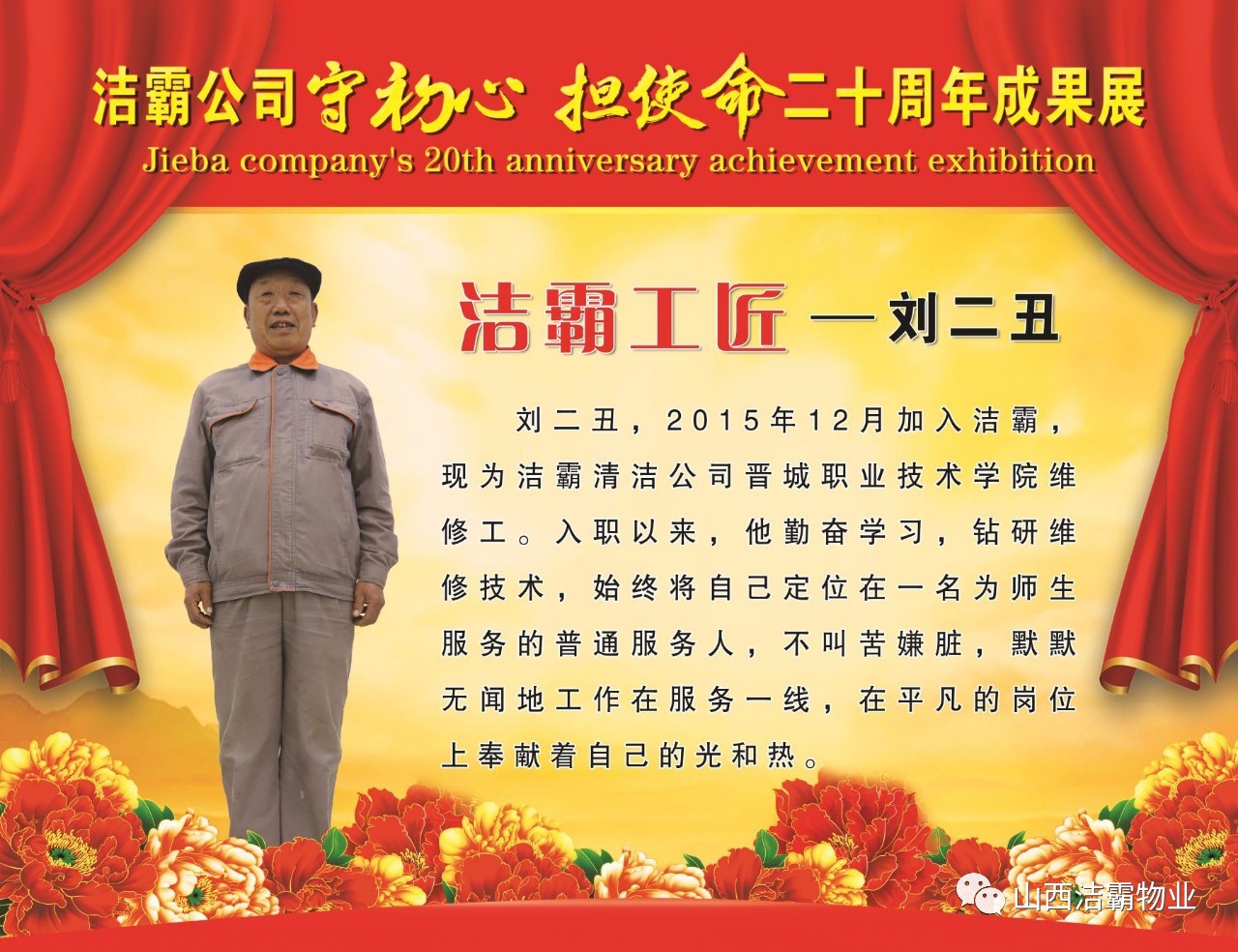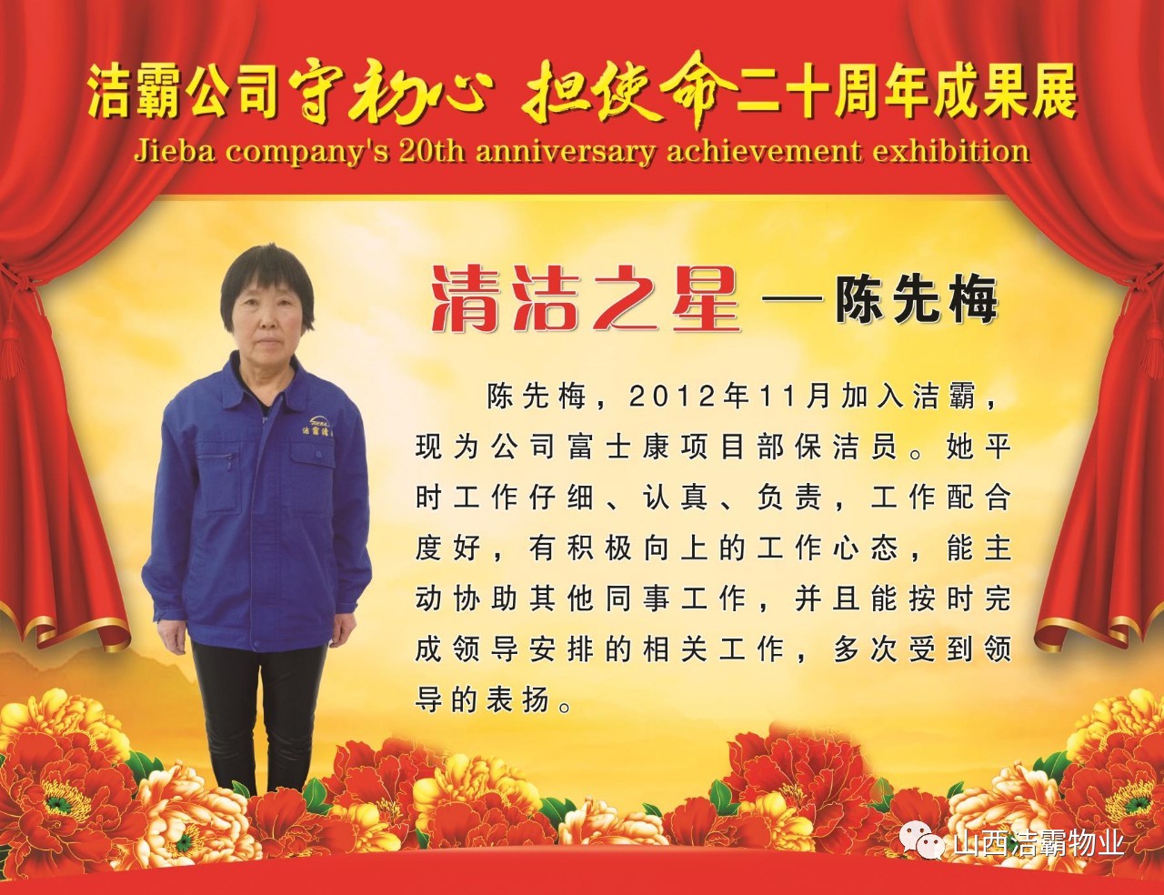 本次晚會(huì)以“潔霸二十華彰,感恩共創(chuàng)輝煌”為主題,此次慶典的核心思想是“感恩”,主要角色是潔霸的創(chuàng)業(yè)者。為此,公司對(duì)入職潔霸的創(chuàng)業(yè)功勛和一線員工進(jìn)行了表彰獎(jiǎng)勵(lì)。本次晚會(huì)共設(shè)8個(gè)獎(jiǎng)項(xiàng),包括“潔霸先鋒”“奉獻(xiàn)之星”“管理之星”“潔霸管家”“潔霸工匠”“清潔之星”“潔霸衛(wèi)士”“園藝之星”等。他們是:李山虎、張永智、史志霞、陳福林、王紅軍、余艷青、劉二丑、成艷粉、楊改梅、王書玲、張國榮、耿竹青、張粉霞、宋秋苗、陳先梅、張晉平、張偉山、趙瑞軍、王廣平、郭志云。晉城市原副市長成育廷、晉城市商務(wù)局原局長王新善、晉城市非公和社會(huì)組織工委書記郎軍芳、晉城市婦聯(lián)三級(jí)調(diào)研員李蓮菊、晉城市總工會(huì)商貿(mào)輕紡煙草服務(wù)業(yè)工會(huì)主席張玉濤、晉城市城區(qū)財(cái)政局局長翟明太等領(lǐng)導(dǎo)為他們頒獎(jiǎng)。