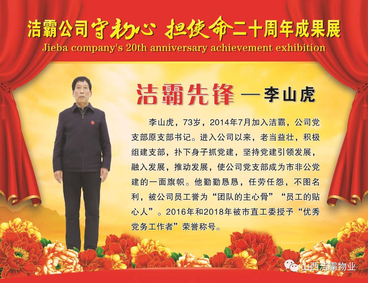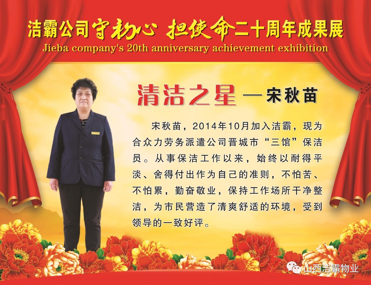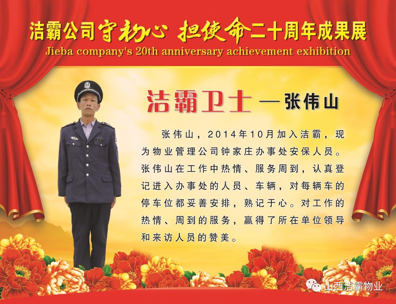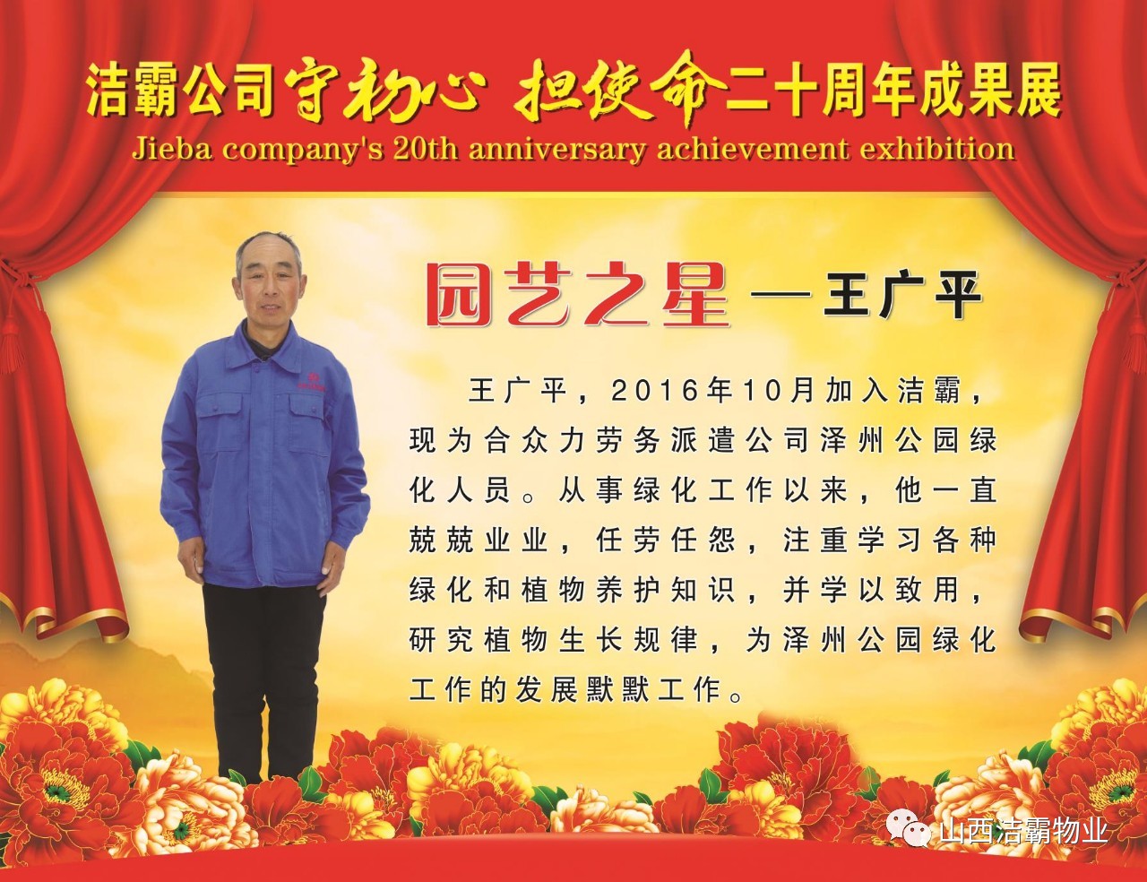 本次晚會(huì)以“潔霸二十華彰,感恩共創(chuàng)輝煌”為主題,此次慶典的核心思想是“感恩”,主要角色是潔霸的創(chuàng)業(yè)者。為此,公司對(duì)入職潔霸的創(chuàng)業(yè)功勛和一線員工進(jìn)行了表彰獎(jiǎng)勵(lì)。本次晚會(huì)共設(shè)8個(gè)獎(jiǎng)項(xiàng),包括“潔霸先鋒”“奉獻(xiàn)之星”“管理之星”“潔霸管家”“潔霸工匠”“清潔之星”“潔霸衛(wèi)士”“園藝之星”等。他們是:李山虎、張永智、史志霞、陳福林、王紅軍、余艷青、劉二丑、成艷粉、楊改梅、王書玲、張國榮、耿竹青、張粉霞、宋秋苗、陳先梅、張晉平、張偉山、趙瑞軍、王廣平、郭志云。晉城市原副市長成育廷、晉城市商務(wù)局原局長王新善、晉城市非公和社會(huì)組織工委書記郎軍芳、晉城市婦聯(lián)三級(jí)調(diào)研員李蓮菊、晉城市總工會(huì)商貿(mào)輕紡煙草服務(wù)業(yè)工會(huì)主席張玉濤、晉城市城區(qū)財(cái)政局局長翟明太等領(lǐng)導(dǎo)為他們頒獎(jiǎng)。