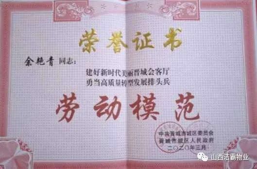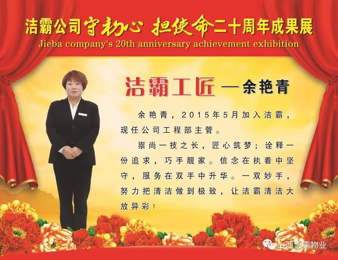 余艷青同志自2015年進入潔霸以來,一直奮斗在工程部的第一線從事主管工作。工作中,余艷青同志愛崗敬業,遵守職業道德,為人誠實守信;她熱愛工作,對待客戶熱情周到、耐心細致;工作中團結同事,責任心強,吃苦耐勞,服從大局,以公司的利益為重。在我市開展的“三洗六見一紅旗”活動和全國文明城市的創建活動中,她帶領員工高標準、高質量、高效率地完成清洗美化工作,為扮靚晉城形象,打造城市優美環境做出了突出貢獻。先后多次被公司評為優秀員工等,2019年在公司成立20周年慶之際,她又被公司授予“潔霸工匠”稱號。