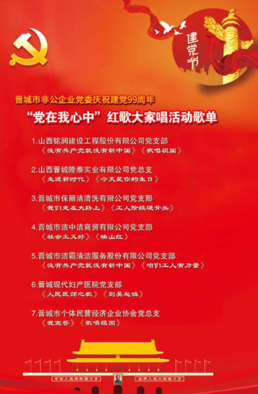 為了慶祝中國共產黨建黨99周年,6月28日,晉城市非公企業黨委在澤州天泰錦辰煤業有限公司組織開展了“黨在我心中”紅歌大家唱活動,潔霸清潔黨支部全體黨員及公司骨干參加演唱活動。