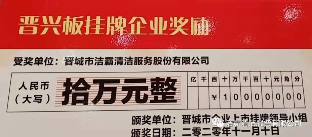 晉城市潔霸清潔服務股份有限公司于2019年11月27日成功登陸山西股權交易中心“專精特新板”(晉興板)(企業代碼:060200Z),是“專精特新板”開板暨首批掛牌的14家企業之一。“專精特新板”是山西股權交易中心設立的特色板塊,為省內具備專業化、精細化、特色化、新穎化的優質企業提供專屬服務,成為帶動全省中小企業創新創造、轉型升級,壯大工業高質量發展的生力軍。“晉興板”掛牌,標志著公司正式進軍資本市場,豐富了融資渠道,推動公司高質量轉型發展,成為公司發展的新引擎。