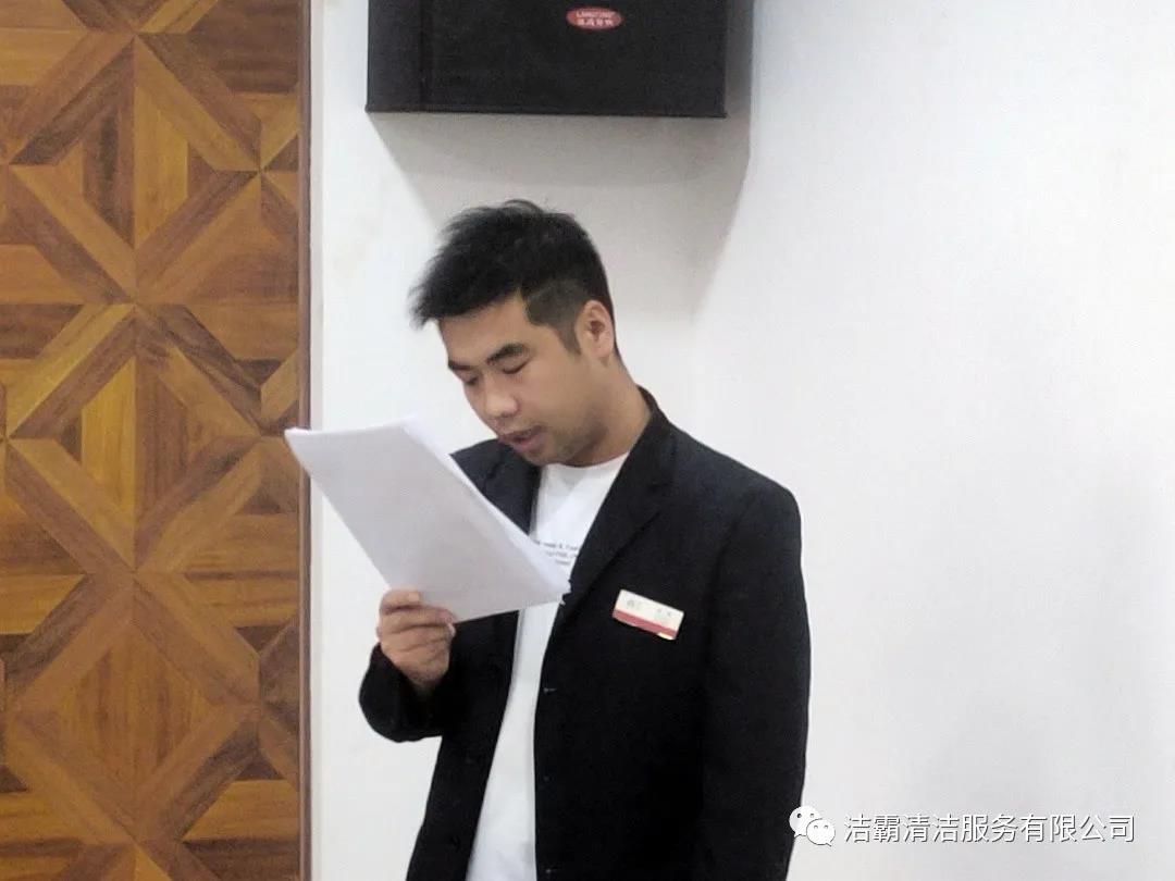 山西潔霸物業管理有限公司經理李廣忠、會計張青霞、出納王頓花、晉城市合眾力勞務派遣有限公司經理成濤、出納劉雨星、晉城市潔霸清潔服務股份有限公司工程部文員張陽楠、綜合辦公室車輛管理員呂衛東、人力資源部文員呂利清、山西百潔物業服務有限公司出納王笑依次上臺作了述職匯報。