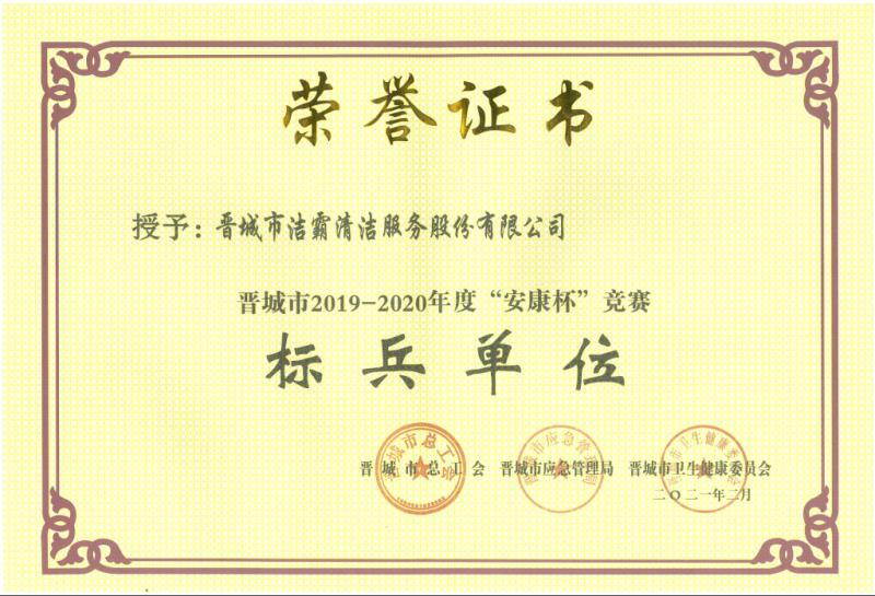 日前,在2019----2020年度全市“安康杯”競賽活動中,晉城市潔霸清潔服務股份有限公司被晉城市總工會、晉城市應急管理局、晉城市衛(wèi)生健康委員會聯合授予“安康杯”競賽“標兵單位”。
