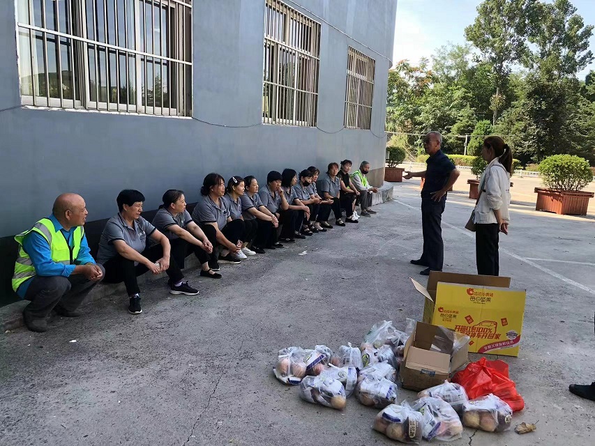 工會主席崔偉一行先后走訪萬達廣場、山西科技學院、晉城市金鳳凰廣場、鳳西廣場、白馬寺、青蓮寺、陽城北留潔霸洗業等地,對戶外高溫下作業的高空清洗員工、物業保潔員工、環衛員工、園林綠化員工及洗衣廠員工等一線勞動者進行慰問。崔主席充分肯定了高溫下堅持奮戰在一線員工的敬業精神,感謝他們為潔霸“戰高溫、斗酷暑”付出的辛勤勞動,并將面包、桃子、白糖等慰問品送到員工手中,讓高溫下堅守在一線的員工感受到來自潔霸大家庭的關愛。