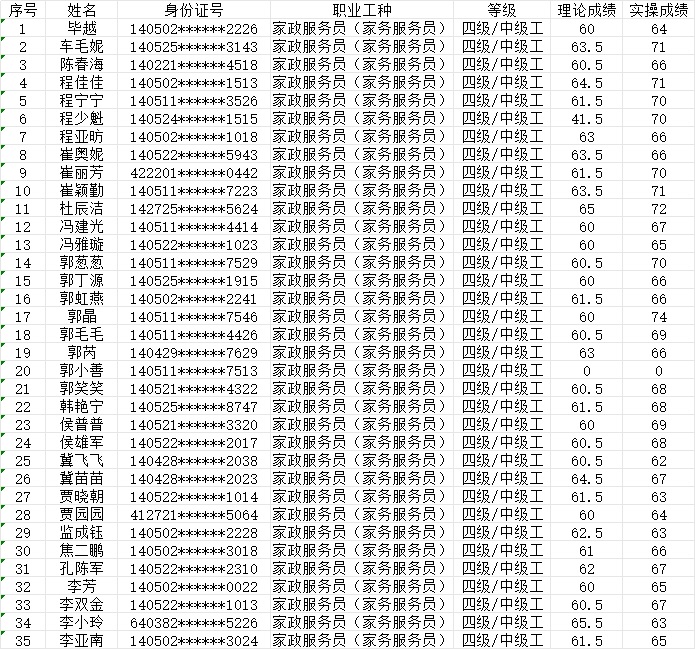 晉城市潔霸清潔服務股份有限公司職業技能等級認定中心現將2024年1月14日認定人員成績公示如下:
