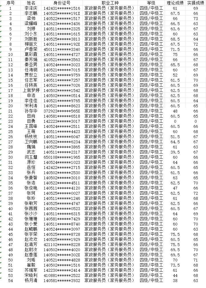 晉城市潔霸清潔服務(wù)股份有限公司職業(yè)技能等級(jí)認(rèn)定中心現(xiàn)將2024年1月21日認(rèn)定人員成績公示如下: