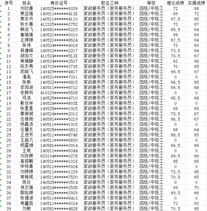 晉城市潔霸清潔服務股份有限公司職業技能等級認定中心現將2024年1月28日認定人員成績公示如下: