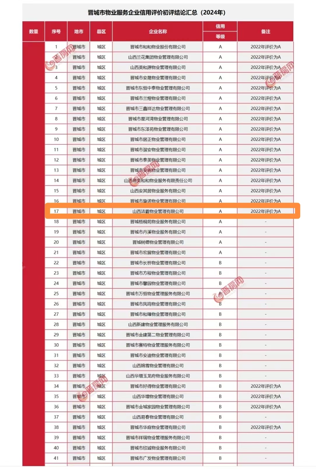 日前,山西省住房和城鄉建設廳發布了2023年度房地產企業信用評價結果的通知,根據通知顯示,晉城市共有200家物業服務公司參加評定,晉城市潔霸物業管理有限公司獲得2023年度物業服務企業信用等級A級認證。在本次考評結果中,潔霸物業光榮上榜,是對其物業服務品質的充分肯定。 |