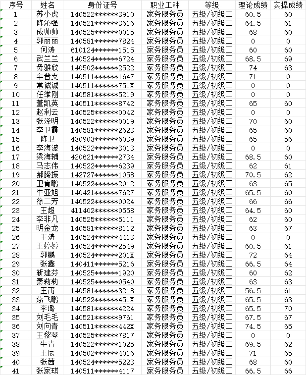 晉城市潔霸清潔服務股份有限公司職業技能等級認定中心 2024年5月26日第17批家政服務員初級認定人員成績公示