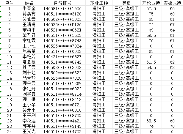 晉城市潔霸清潔服務股份有限公司職業技能等級認定中心現將2024年6月30日認定人員成績公示如下: