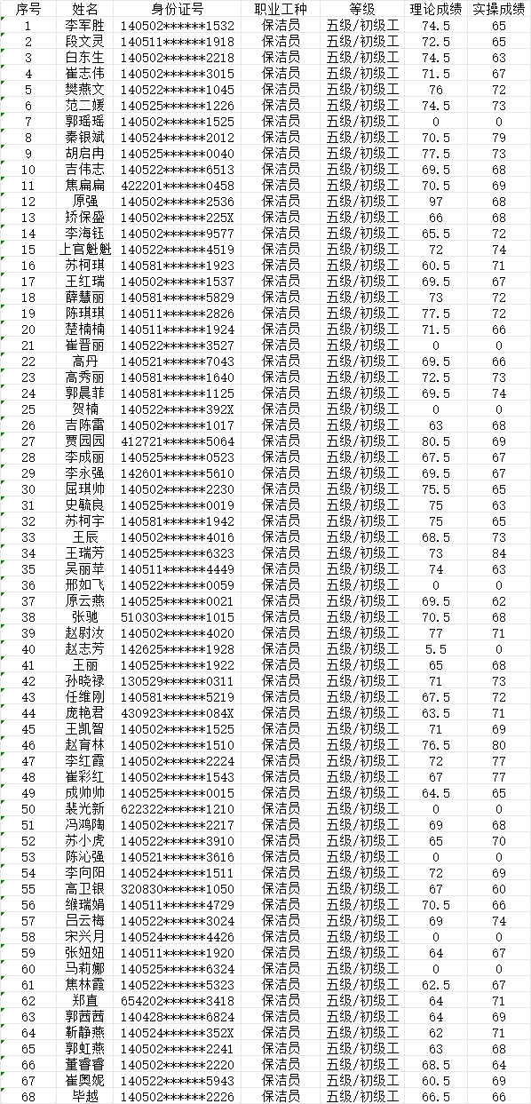 晉城市潔霸清潔服務股份有限公司職業技能等級認定中心現將2024年7月7日認定人員成績公示如下: