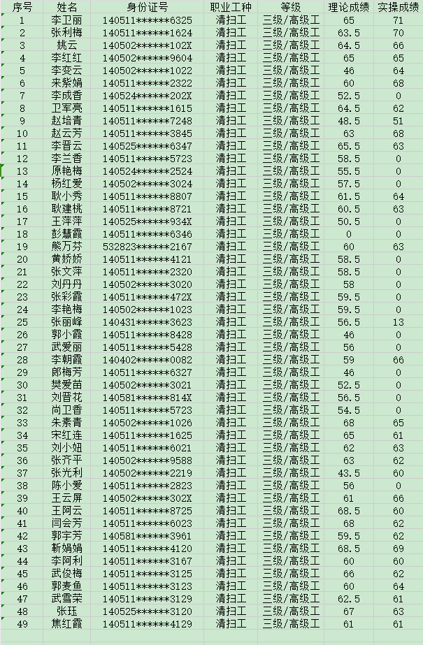 晉城市潔霸清潔服務股份有限公司職業技能等級認定中心現將2024年8月3日認定人員成績公示如下:
