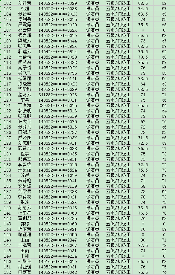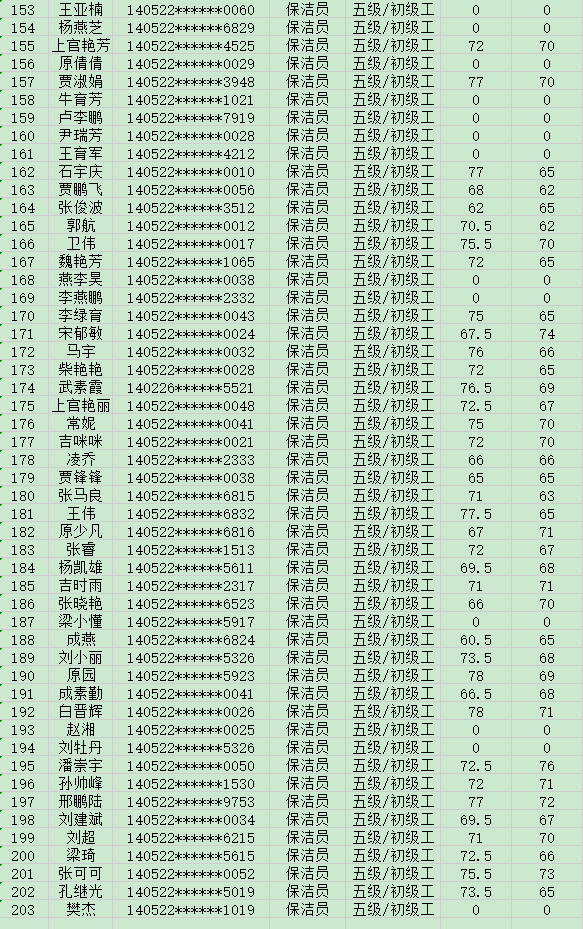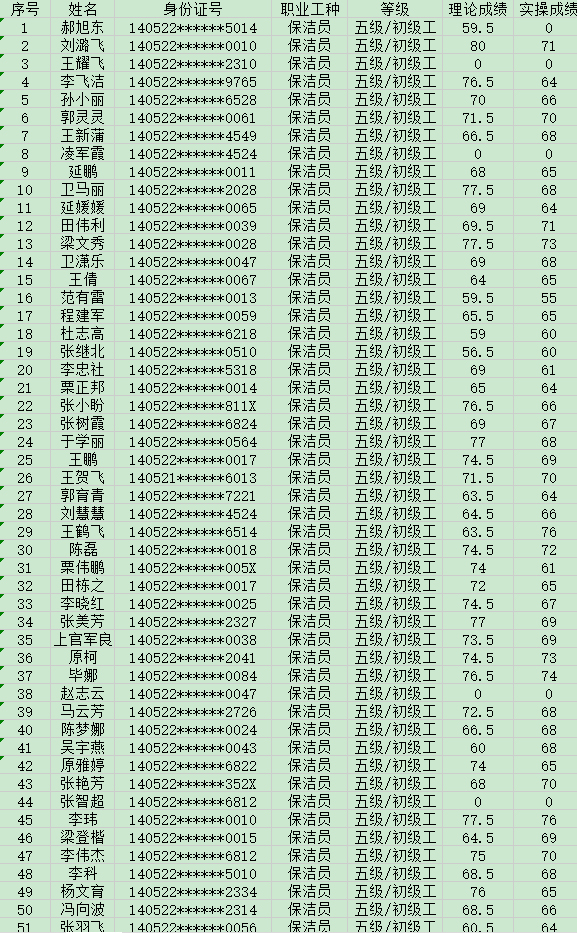晉城市潔霸清潔服務股份有限公司職業技能等級認定中心現將2024年8月17日認定人員成績公示如下: