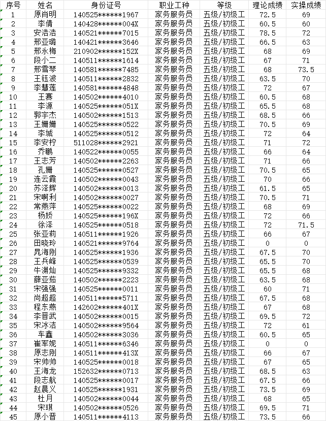 晉城市潔霸清潔服務股份有限公司職業技能等級認定中心現將2024年9月28日認定人員成績公示如下: