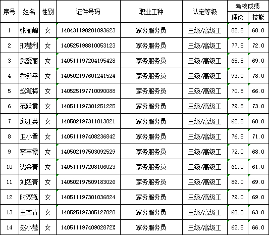 山西潔霸清潔服務集團股份有限公司職業技能等級認定中心現將2025年9月13日認定人員成績公示如下: