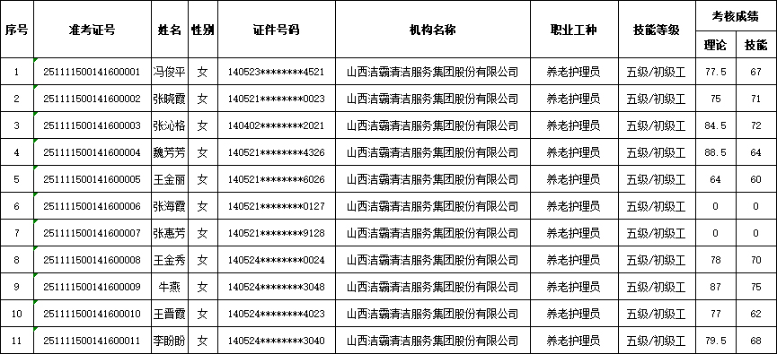 山西潔霸清潔服務集團股份有限公司職業技能等級認定中心現將2025年11月15日認定人員成績公示如下:
