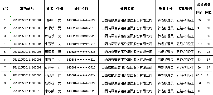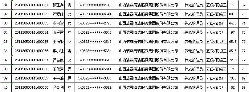山西潔霸清潔服務集團股份有限公司職業技能等級認定中心現將2025年11月22日認定人員成績公示如下:
